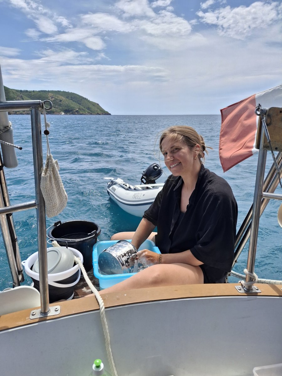 Wir nutzten die Tage auch, um unser Bordleben zu optimieren: Eine Salzwasser-Fusspumpe für die Küche wäre toll, aber dafür müsste ein Loch in den Rumpf und Scialla aus dem Wasser - also eher eine Arbeit für den Winter (die Pumpe liegt seit März in der Hundekoje bereit). Stattdessen kauften wir ein Becken: Abwaschen mit Salzwasser auf der Badeplattform, danach Süsswasser-Spülung aus der Heckdusche – Low Cost Living deluxe!