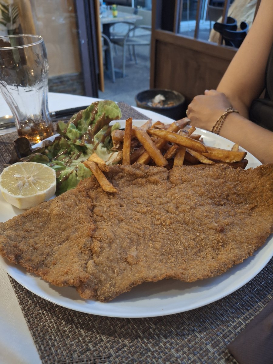 Nach dem Anlegen suchten wir uns ein Restaurant: Pizza für Jan, Schnitzel Milanese für Janine – angeblich das Original vom Wiener Schnitzel, wer weiss! Ohne Wind war es drückend schwül, aber wir nutzten die Zeit für To-dos. Der nächste Waschsalon lag 1,5 km entfernt im Zentrum – also alles aufs Wägelchen und losgezottelt. Früh aufstehen lohnte sich: Wäsche und Trockner in unter einer Stunde erledigt und somit auf dem Heimweg bevor die grosse Mittagshitze begann.