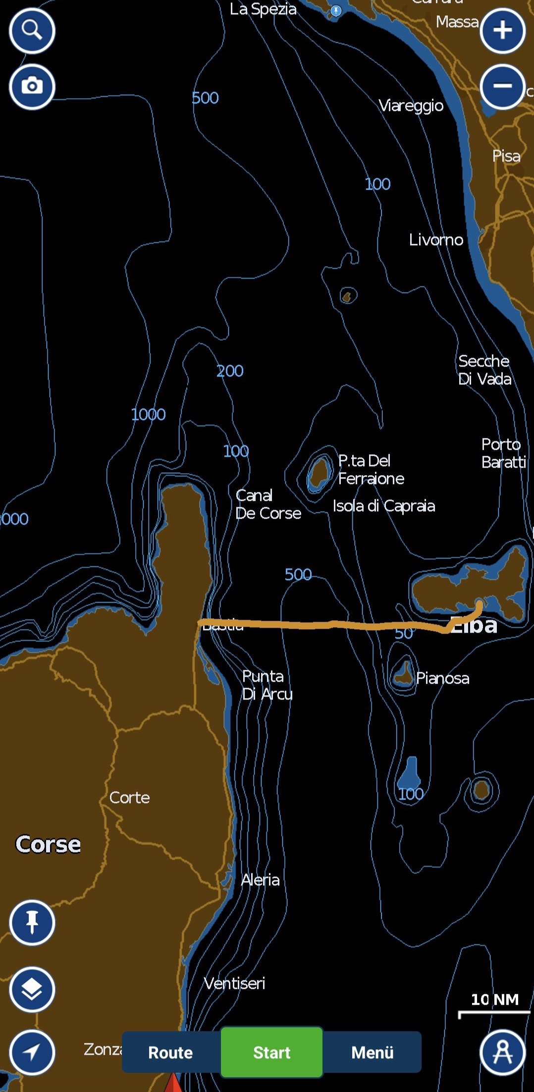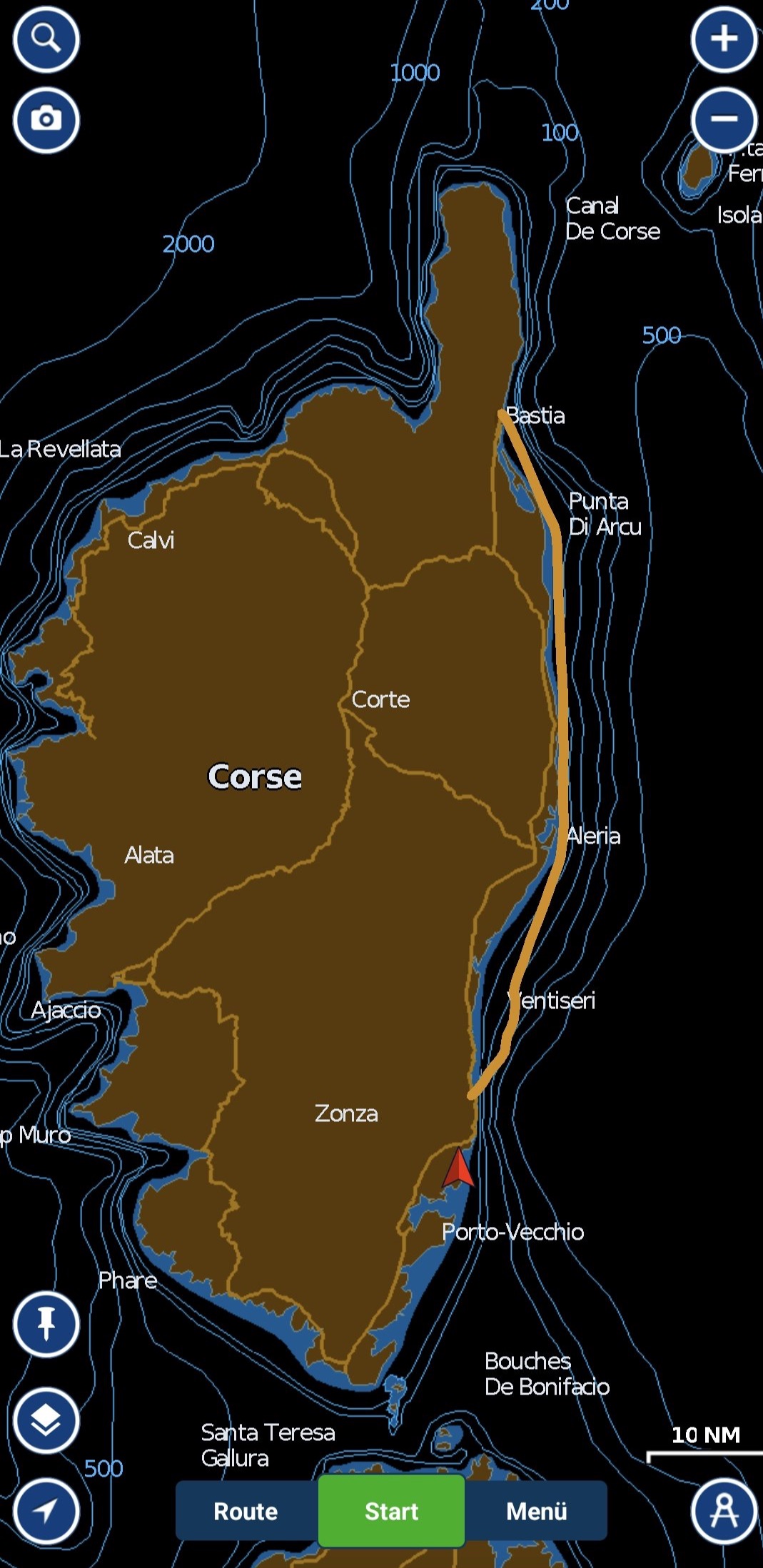 Am Freitag war es so weit: Kurs auf Korsika! Die Ostseite hat kaum geschützte Buchten, daher entschieden wir uns für erstmal für Bastia im Norden der Insel – genauer gesagt für den kleinen Hafen Toga. Nach etwas holprigem Französisch am Telefon und einer E-Mail war der Platz gebucht. Unsere bisher längste Fahrt (41.5sm) stand bevor – zum Glück mit gutem Wind, also segelten wir den Grossteil (3 Stunden lief der Motor von gesamthaft 8.5 Stunden). Wir konnten das erste Mal eine Gastlandflagge hissen!