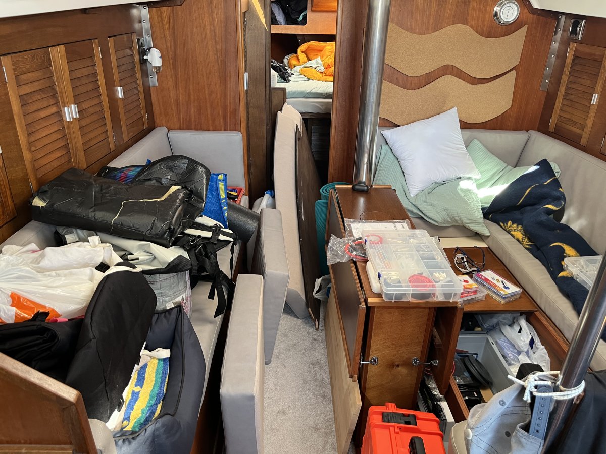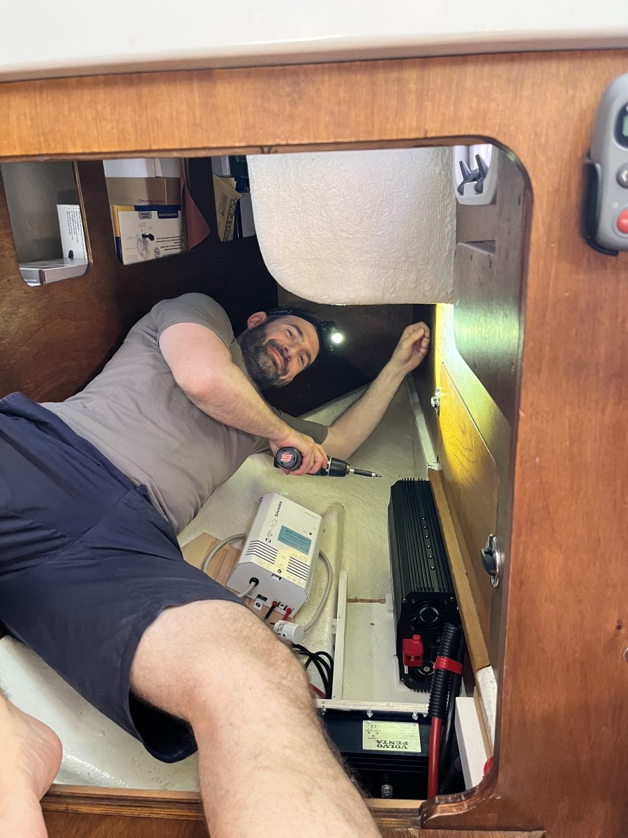 Der neue Inverter wurde geliefert und direkt eingebaut. Bootsprojekte bedeuten übrigens fast immer komplettes Chaos – auf dem begrenzten Raum sieht es schnell mal aus wie nach einem kleinen Orkan.