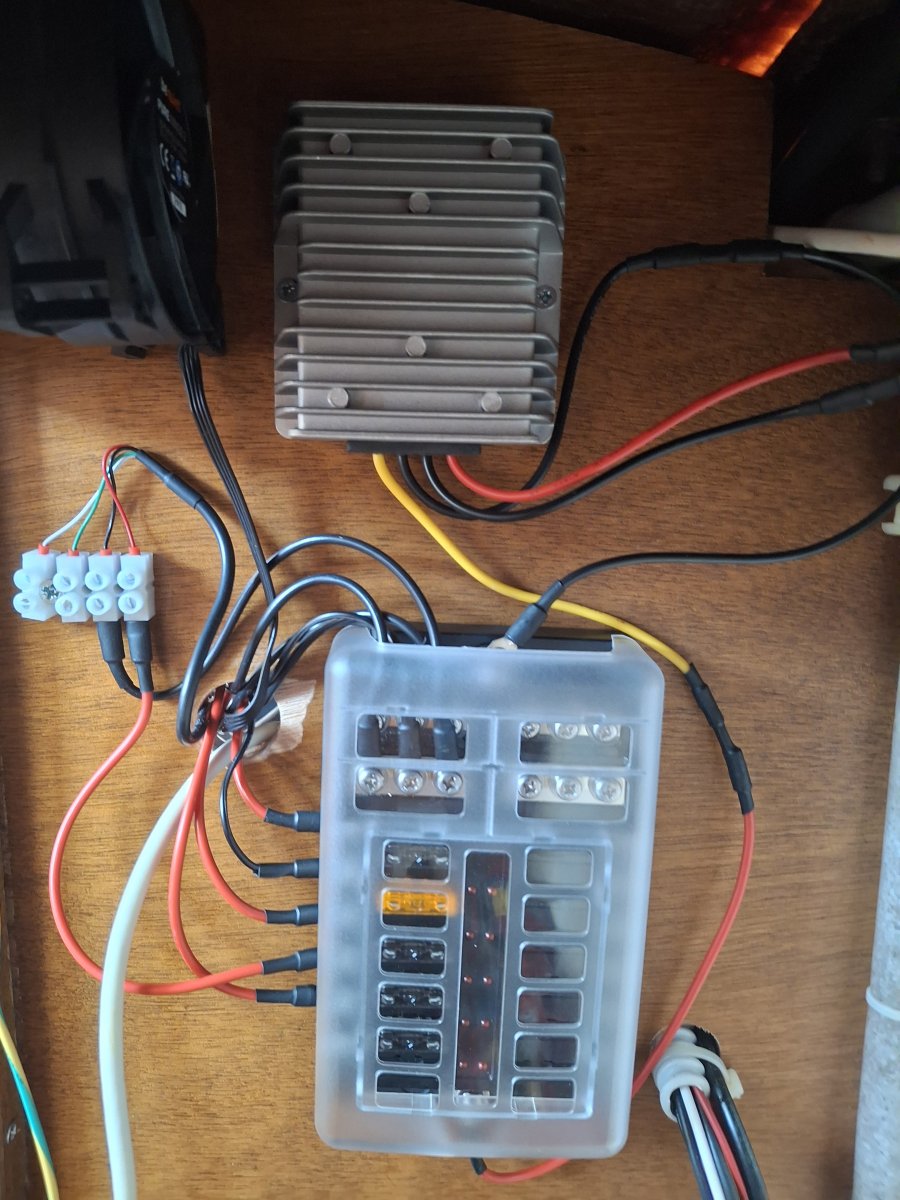 Zum Abschluss noch was nerdiges: Jan hat den Server, Wlan & 5G Router installiert – jetzt können wir unsere Serien und Filme bequem via Jellyfin streamen. Perfekt für verregnete Abende an Bord. Dazu wurde ein 12V-Spannungsstabilisator mit separater Sicherungsbox verbaut um die Geräte direkt mit DC-Strom zu versorgen.