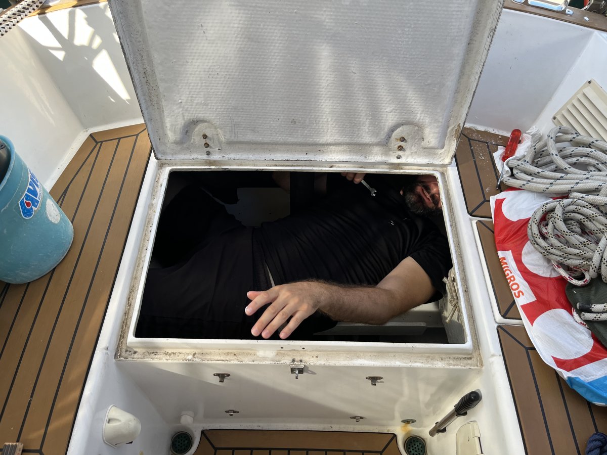 Gestartet sind wir mit einem vermeintlich kleinen Task: der Ersatz der Lippklampe, die in Olbia kaputtging. Zwei Schrauben setzen – klingt einfach. In der Praxis bedeutete das über zwei Stunden Arbeit: Backskiste aus- und einräumen, alte Löcher abdichten, neue bohren. Jan zwängt sich mit einem Schraubenschlüssel in die Backkiste während Janine von oben die Schrauben löst / anzieht. Typisch Bootsarbeit – alles dauert länger.