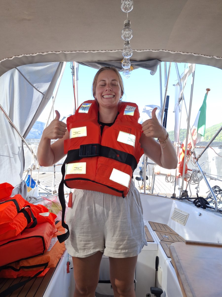 Jan versetzte die Klampe etwas nach innen, damit die Schot nicht mehr am Metall reibt. Nun glänzt die neue Lippklampe an ihrem Platz. Nebenbei räumte Janine die alten Rettungswesten (Bild) aus und verstaute die neuen. Das schuf Platz – sogar unsere Gummistiefel, bisher ungenutzt, fanden nun ihren Platz unter der V-Berth.