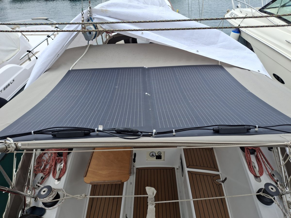 Jan schaltete sie Seriell, sodass sie wie ein grosses Panel arbeiten (das erhöht die Volt, was zu einer besseren Leistung bei schwacher oder flacher Sonneneinstrahlung führen sollte). Ein Nachteil ergibt sich bei einer Teilbeschattung eines Panels. Falls dies zu oft der Fall sein sollte, wird Jan die Panels Parallel verbinden. Da wir im Hafen ohnehin Landstrom haben, ist es nicht zwingend notwendig – aber Optimierungen sind immer gut.