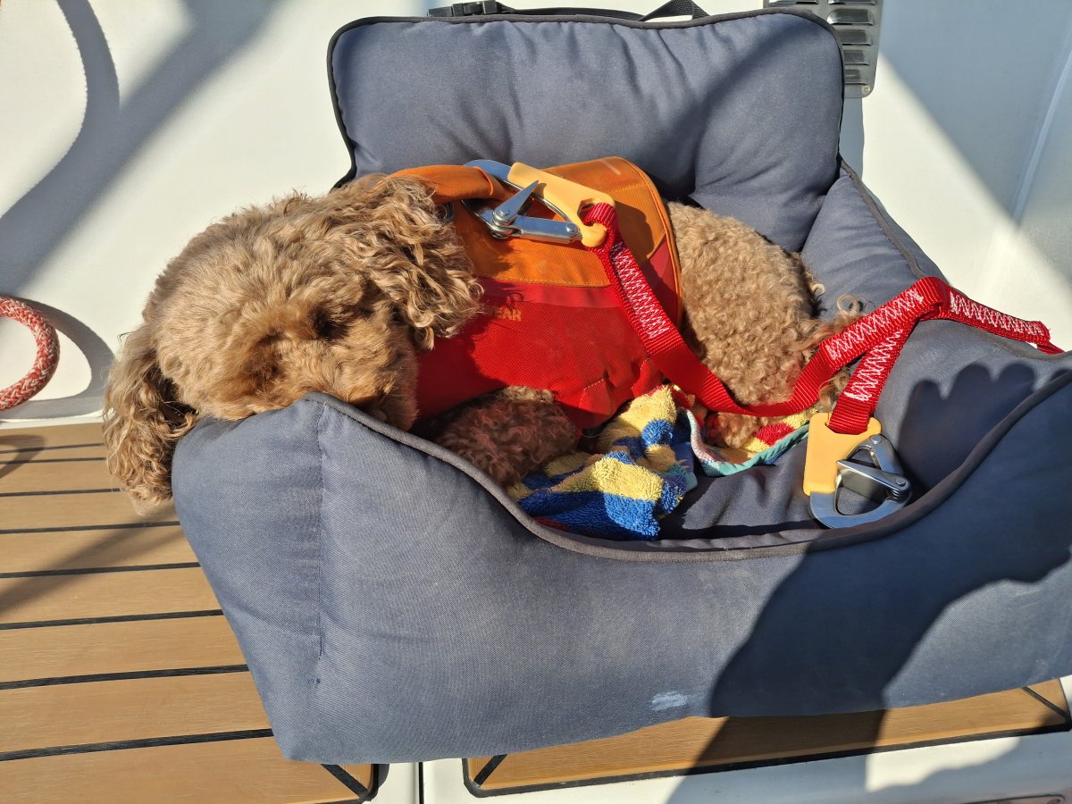 Das erste Reff im Gross reichte nicht, das Boot wurde in der Welle instabil. Also: Rettungswesten an, Grosssegel bergen (besonders wichtig bei solchen windigen & welligen Angelegenheiten: „Eine Hand fürs Boot, eine für mich!“), Fock reffen – und weiter mit 5 Knoten in hohen, aber voran schiebenden Wellen. Juna beeindruckte nichts von alldem, sie schlief seelenruhig in ihrem Bettchen.
