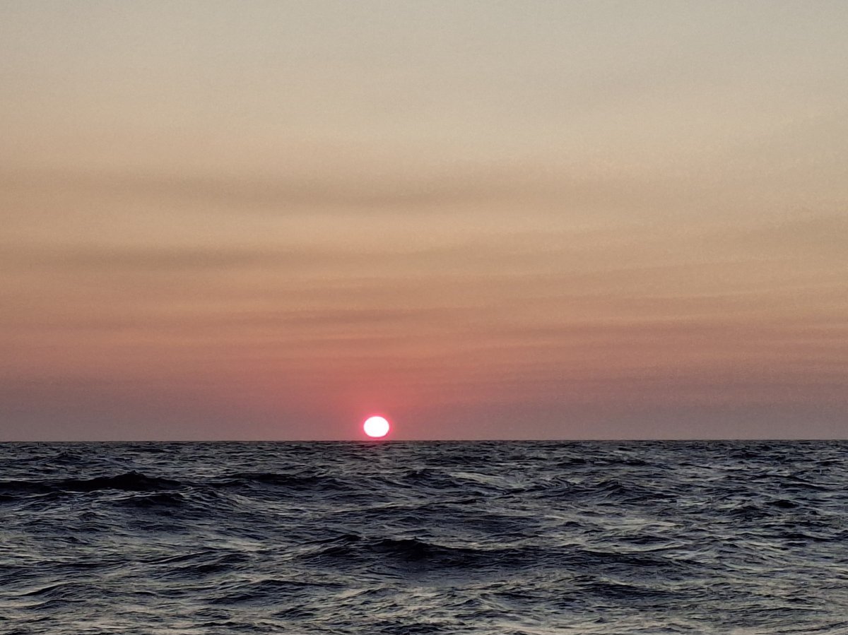 Unsere erste Nachtfahrt begann. Wir fuhren im Schichtsystem: 2–3 Stunden Ausguck, der andere versuchte zu schlafen. Gar nicht so einfach, bei so hohen Wellen. Nachts ist kaum Verkehr, hauptsächlich Tanker und Fischer – trotzdem blieb der Rundumblick Pflicht. Es war ein extrem schönes Erlebnis mal so Offshore unterwegs zu sein und nachts die Sterne inklusive der Milchstrasse über einem zu sehen. Wir vertrieben uns die Zeit mit Podcasts oder Hörbüchern, die wir im Voraus heruntergeladen haben, Internet gibt es so weit aussen nicht.