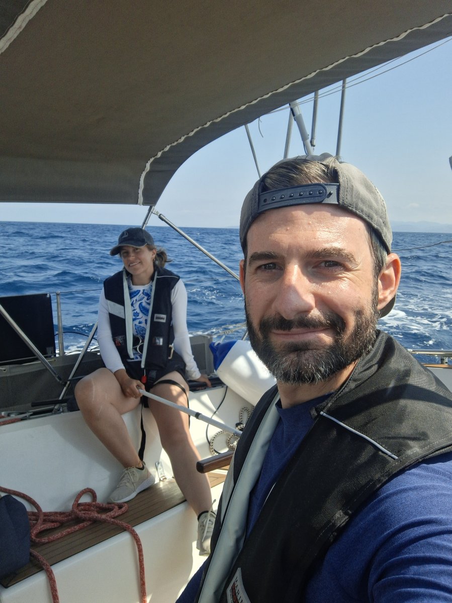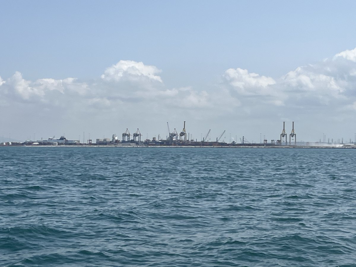Die Route führte am Industriehafen von Livorno vorbei – viele Frachtschiffe, Fähren, Kreuzfahrtriesen. Die Spannung war hoch, aber wir meisterten es und konnten danach endlich segeln: am Wind, mit Leichtwind, Motor aus – pure Ruhe! Allerdings klemmte etwas beim Hissen des Grosssegels, also setzten wir das erste Reff (→ Reff = Segel wird verkleinert bei viel Wind). Trotzdem waren wir zügig unterwegs (Scialla hat ein leicht überdimensioniertes durchgelattetes Grosssegel).