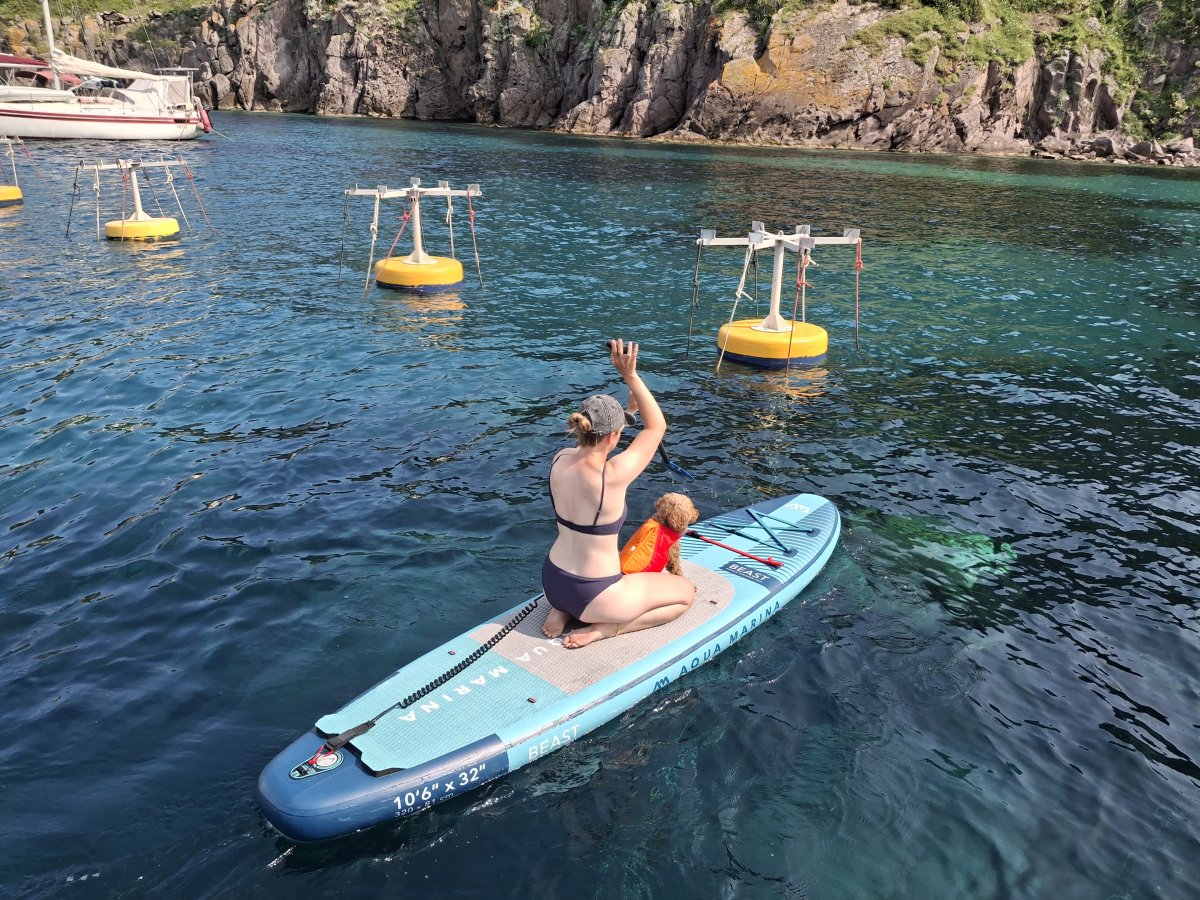 Morgens erkundeten wir das Dorf, danach ging es zurück aufs Boot in den Schatten. Den Rest des Tages verbrachten wir mit schwimmen, lesen und Blog schreiben. Juna war auch das erste Mal mit auf dem SUP und machte es grossartig. Sie sass einfach ruhig da und schaute sich um. Wenn jemand von uns schwimmen geht, steht sie hinten auf der Badeplattform und schaut ganz gespannt, wo die Person jetzt hingeht. Selber schwimmen findet sie noch nicht so toll - vielleicht kommt es ja noch.