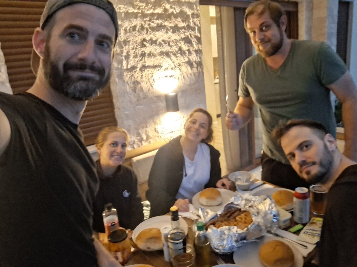 So wurde der Mittwoch zum Entspannungstag. Am Donnerstag, dem letzten Tag von Marion und Marco, fuhren die beiden mit dem Taxi nach Kotor, während wir an Bord blieben – es waren Sturmböen angesagt, da lassen wir das Boot nicht gern unbeaufsichtigt. Wir nutzten die Zeit, bereiteten das Bett für Jan vor und entdeckten endlich auch den Waschsalon der Marina. Abends gab es noch einmal Cevapcici, Plescaviza, Poulet und Würste – ein würdiger Abschluss für schöne Tage zu fünft.