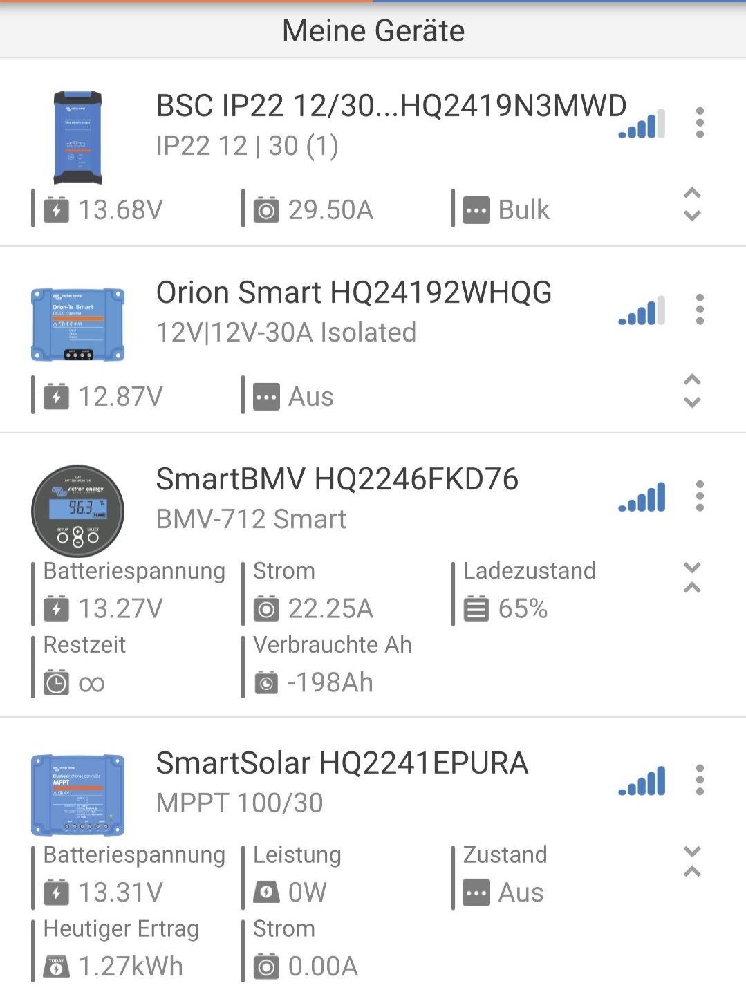 Da sich die Sonne in den kommenden Tagen eher rar macht und das Solarpanel entsprechend wenig liefert, durften ausnahmsweise mal wieder die Batterien an den Landstrom. Einmal voll auf 100 % laden tut nicht nur der Stimmung gut, sondern auch den Zellen – vier pro Batterie –, die sich dabei wieder sauber balancieren können. Praktischerweise ist alles von Victron, was bedeutet: bequem per Bluetooth überwachen und konfigurieren.