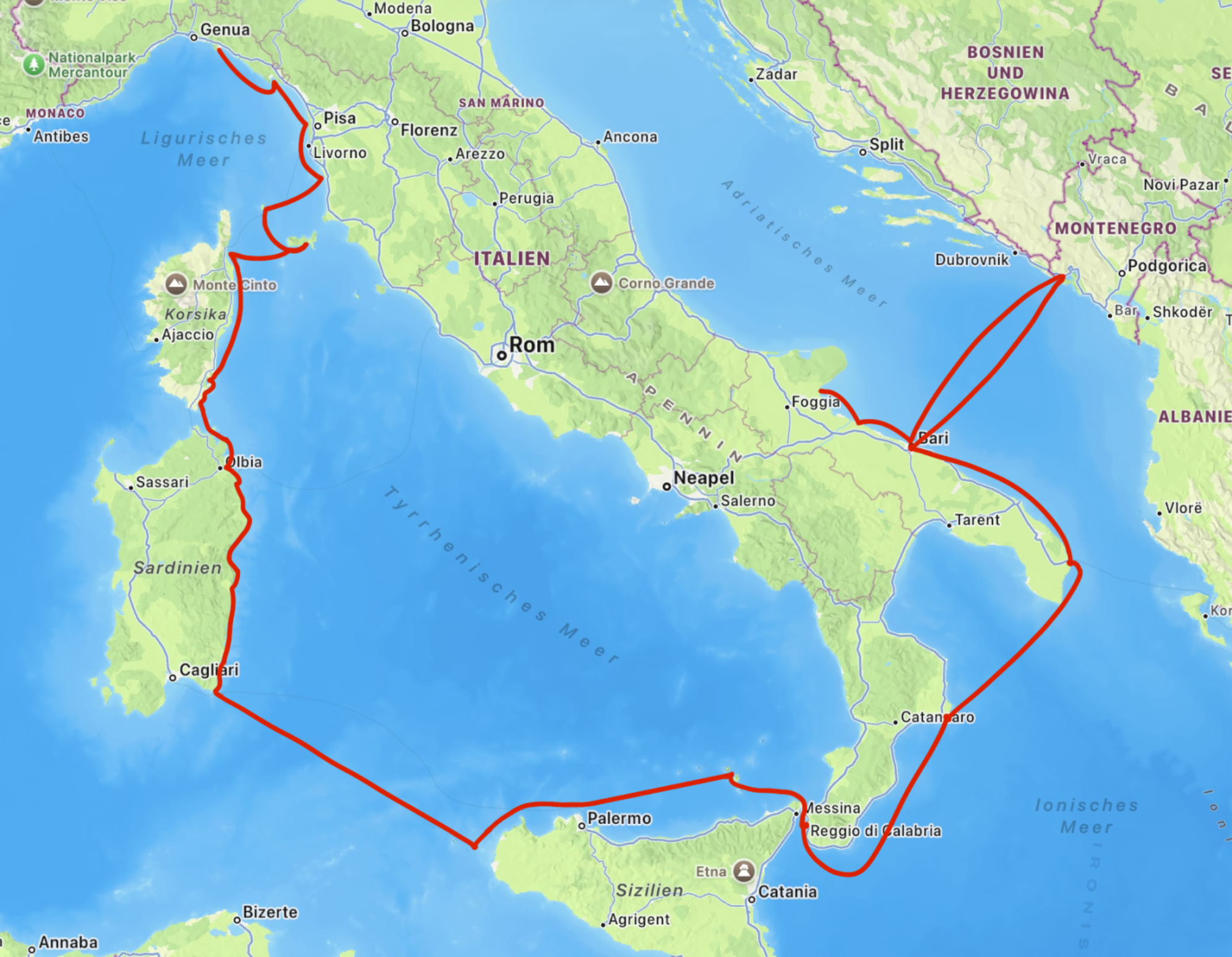 Von der Insel Vulcano aus setzten wir unsere Reise zum italienischen Festland fort. Dabei durchquerten wir die Strasse von Messina, um die Queens Marina 88 bei Reggio Calabria zu erreichen. Die Stadt ist strategisch günstig gelegen, uns hat es dort allerdings nicht wirklich gefallen. Danach folgten weitere Stopps in Crotone, Otranto und Bari, bevor wir die grosse Überfahrt nach Montenegro angingen. Otranto hat uns besonders gut gefallen. Auch wenn sich Jan dort den Magen verdorben hat, würden wir gerne noch einmal dorthin. Das war übrigens das einzige Mal, dass jemand von uns krank war, seit wir die Schweiz verlassen haben.