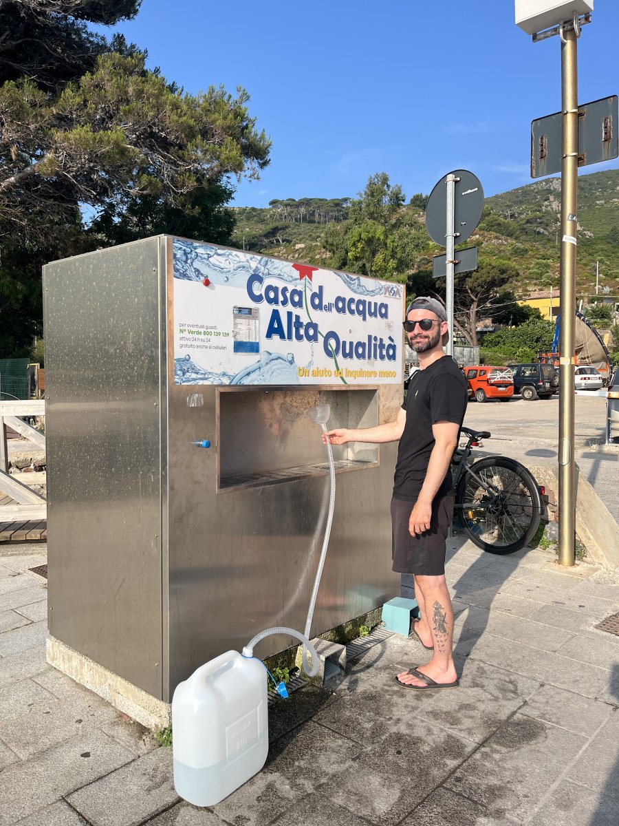 Das SUP kam regelmässig zum Einsatz und die Spaziergänge ins Dorf wurden zur Routine. Mittwochs bereiteten wir alles für die Weiterfahrt vor: Im Mini-Markt füllten wir unseren Gemüsevorrat auf und holten an der praktischen Wasserstelle mehrmals frisches, eiskaltes Wasser. Den 20-Liter-Kanister füllten wir viermal in unsere Tanks an Bord. Die letzte Füllung behielten wir im Kanister und fügten Silberionen hinzu für haltbares Trinkwasser – das spart PET-Flaschen.