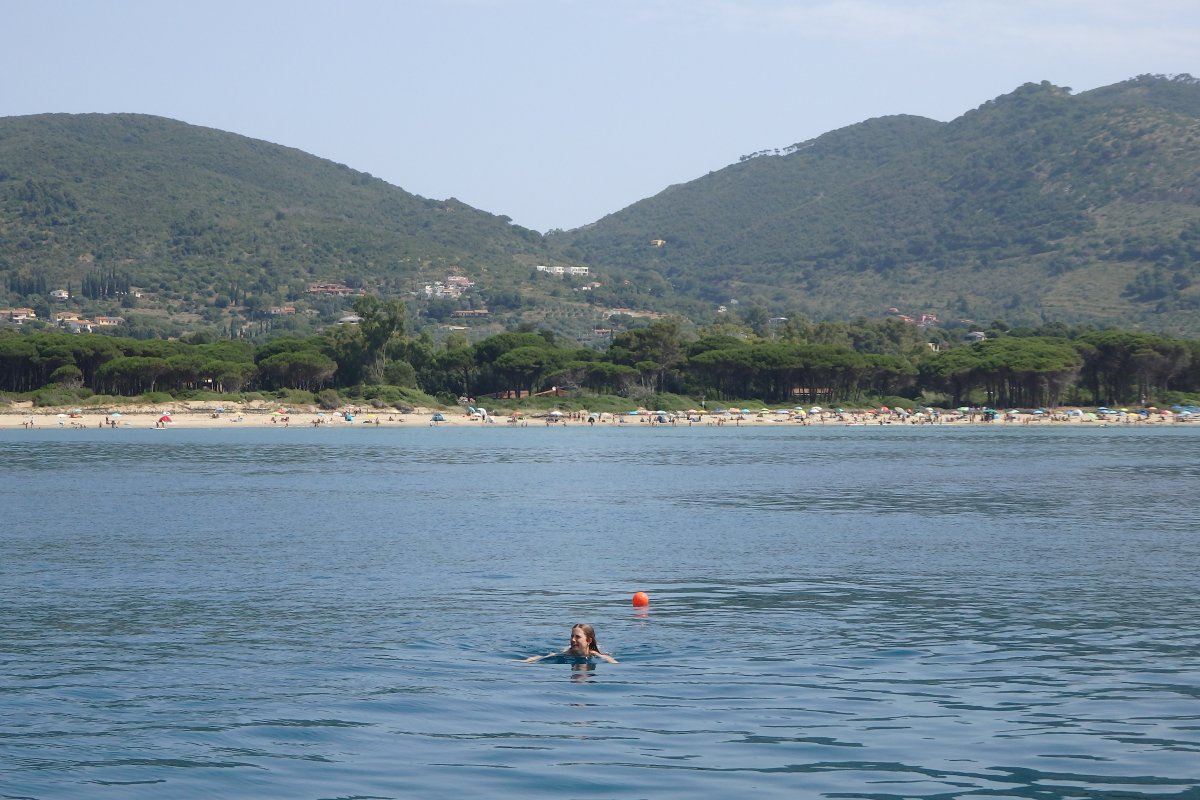 Donnerstag früh machten wir uns auf den Weg nach Elba: 30 Seemeilen lagen vor uns. Mit dem Motor wären es etwa sechs Stunden bei 5 Knoten gewesen – unter Segeln dauerte es etwas länger. Der Wind schlief zwischendurch ein, also mussten wir rund vier Stunden (gesamt waren wir 8 Stunden unterwegs) motoren. Unser Ziel: die Bucht „Marina di Campo“ auf Elbas Südseite. Die letzten Stunden konnten wir herrlich vor dem Wind segeln mit bis zu 6 Knoten :)