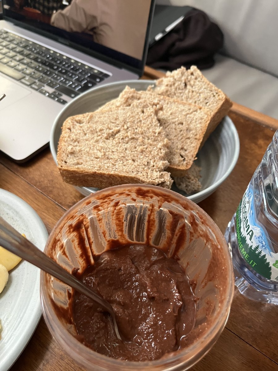Janine hat sich diese Woche wieder an einem Brot versucht – und dazu ein selbstgemachtes Nutella gezaubert! Eine gesunde Alternative aus Kichererbsen, Datteln, Kakaopulver, ein bisschen Caotina und Vanillearomatropfen. Das Brot backen wir nun in einer Cakeform, da unser Ofen nur Unterhitze hat. Nächstes Mal wollen wir mit längerer Gehzeit experimentieren – Zeit haben wir ja.