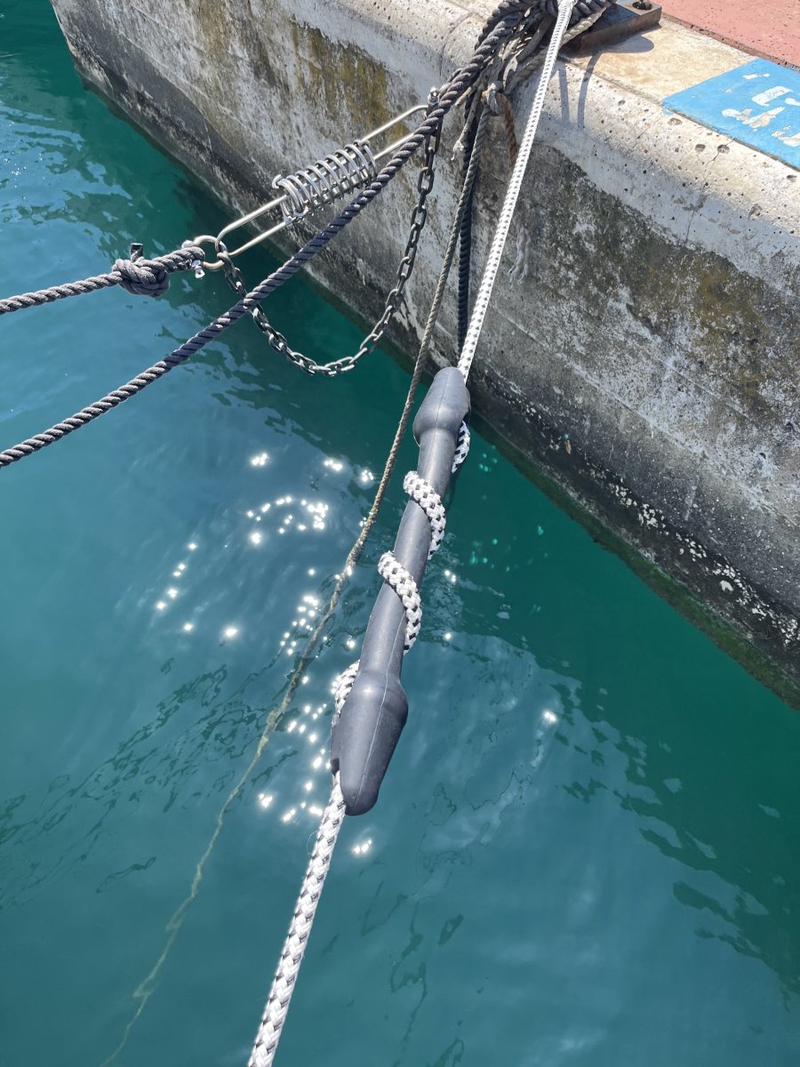 Nach einer sehr unruhigen Nacht mit ständigem Krachen in die Leinen war klar: So geht es nicht weiter. Wir haben uns also Stossdämpfer besorgt – die günstigere Variante aus Gummi anstatt einer Metallfederung, aber der Effekt ist trotzdem enorm. Der Unterschied ist sofort spürbar – weniger Ruck, weniger Lärm, mehr Entspannung für uns, die Leinen und die Klampen.