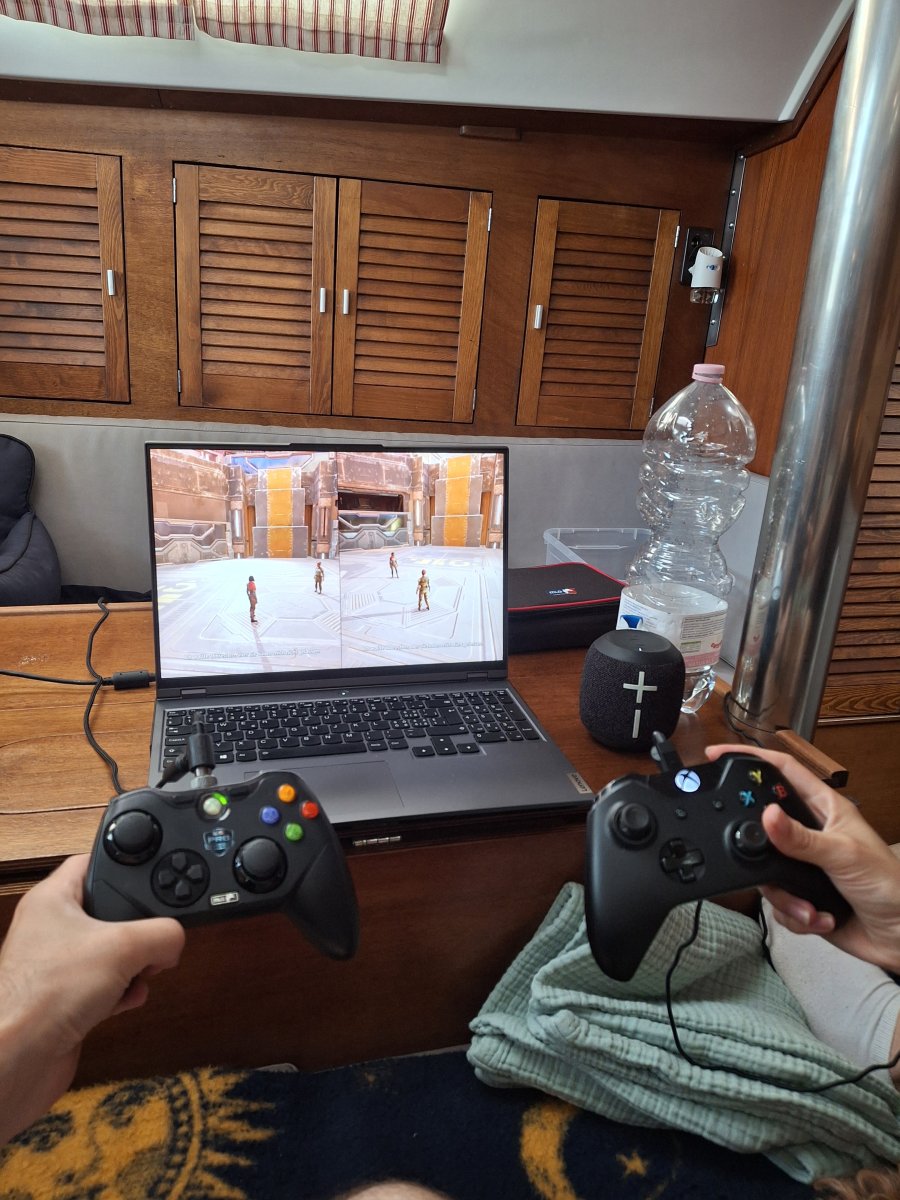 Abends ist es noch zu kühl, um lange draussen zu sitzen. Also wurde der Gaming-Laptop ausgepackt und „Split Fiction“ gespielt (danke für die Controller Lysop222). Zum Glück ist Jan so geduldig mit mir…