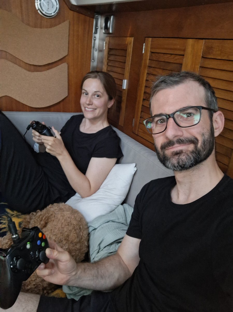 Auch auf der technischen Seite ging’s voran: Jan hat sich dem zweiten Solarladeregler gewidmet. Die beiden flexiblen 100-Watt-Panels – eins auf jeder Seite – versorgen uns nun morgens und abends (wenn das Hauptpanel nicht so viel Leistung bringt) zuverlässig mit Strom. Den brauchen wir hauptsächlich für die Kühlschränke (ja wir haben zwei ;-)), den Server und die Induktionskochplatte. Der Rest der Stromverbraucher fallen nicht wirklich ins Gewicht, da der Vorbesitzer dankenswerterweise alle Lichter auf LED umgerüstet hat und die Pumpen (WC & Frischwasser) nur für kurze Zeit laufen. Falls es mal längere Regenphasen gibt, haben wir zum Kochen das Gas und den Server könnten wir in dieser Zeit runterfahren. Zusätzlich könnten wir die Batterien über den Dieselmotor und ein eigens dafür eingebautes Ladegerät laden. Jan hat für praktisch alles einen Backup-Plan.