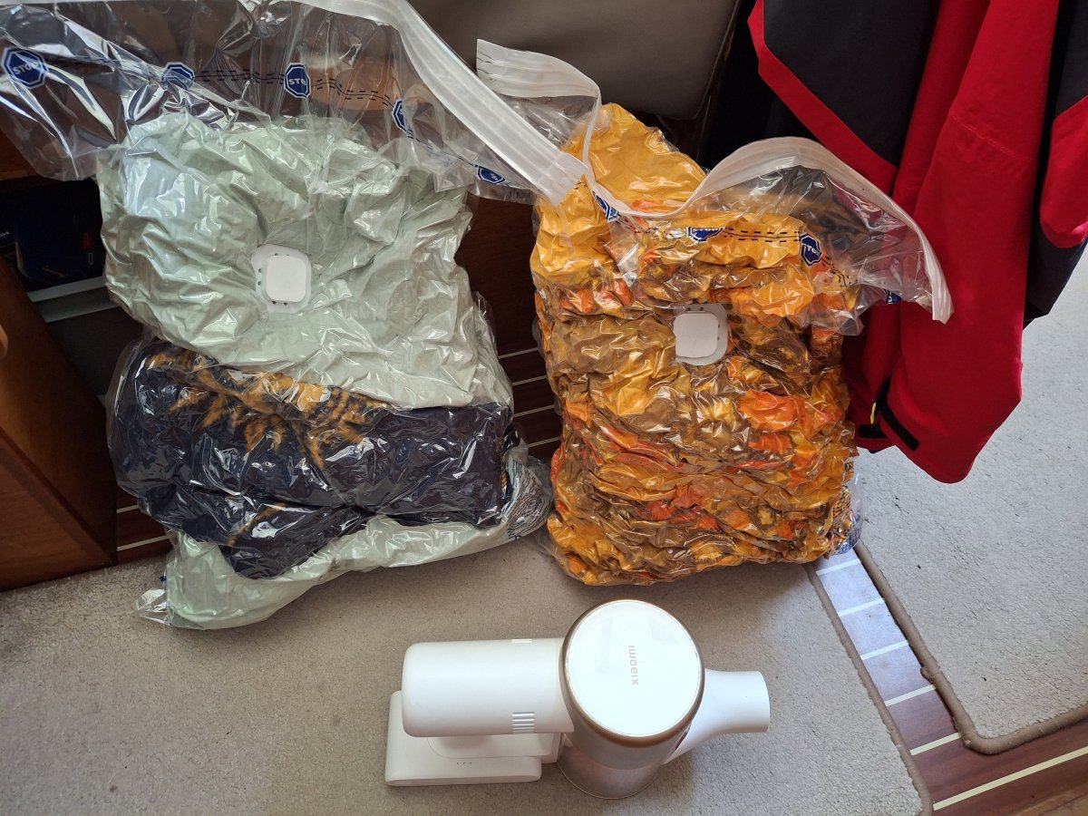 Die beiden Kühlschränke mussten abgetaut und geputzt werden, draussen wurde alles gesichert, sämtliche Schränke blieben offen, damit Luft zirkulieren kann, und alle Polster sowie Kissen stellten wir hoch, damit sich möglichst wenig Feuchtigkeit sammelt. Unsere Decken verstauten wir in Vakuumsäcken.