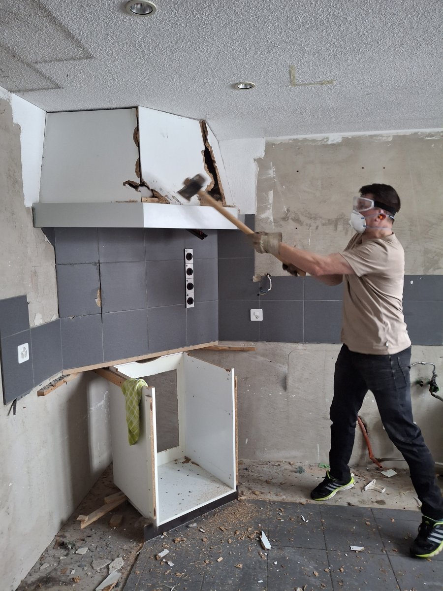 Am 1. Januar hiess das also: alte Küche ausbauen. Eine solide, 35 Jahre alte Küche ist erstaunlich robust gebaut. Beim Dampfabzug musste schliesslich sogar der Vorschlaghammer zum Einsatz kommen – sehr zur Freude der beiden Männer.