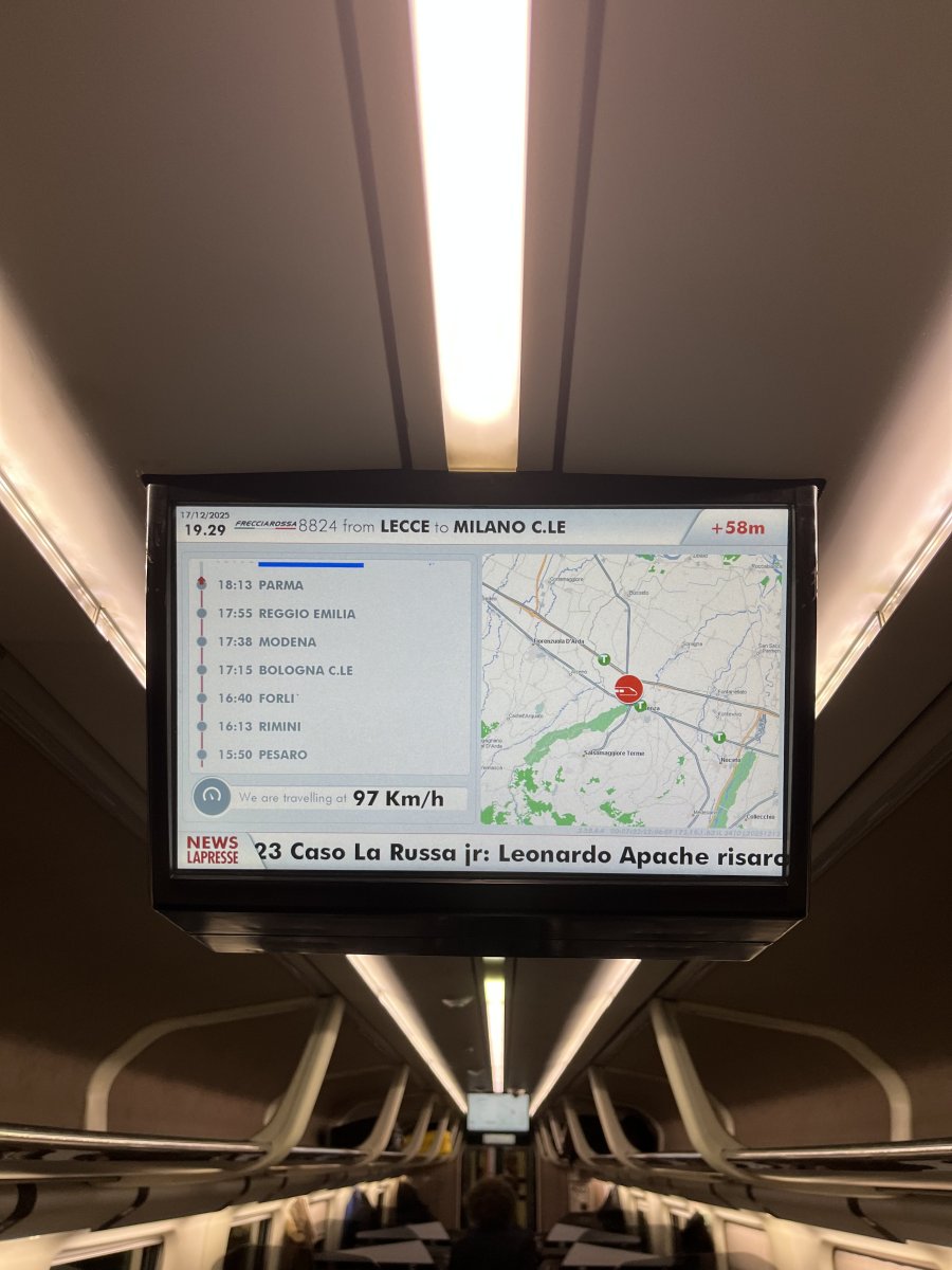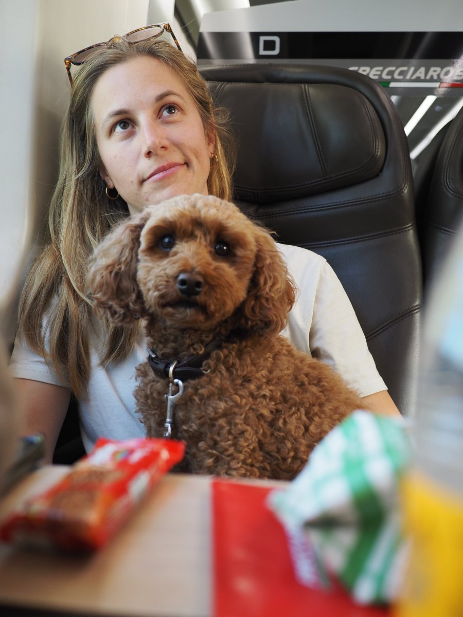 Der Zug nach Mailand war erstaunlich leer – dafür, dass gerade Olympia stattfand. In Mailand verliessen wir kurz den Bahnhof, um frische Luft zu schnappen, mit Juna eine letzte Pipirunde zu drehen und etwas zu essen. Wer den Bahnhof in Mailand kennt, weiss: Es ist fast wie Bingo. Das Gleis für den Zug wird oft erst wenige Minuten vor Abfahrt auf der grossen Anzeigetafel angezeigt.