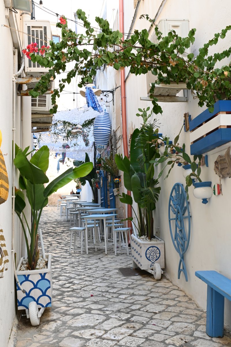Mit 28 Metern Kette bei vier Metern Wassertiefe und sicher eingegrabenem Anker, lagen wir in der Bucht vor Otranto. Mit dem Dinghy fuhren wir in den alten Fischerhafen der nun vor allem von Sonnenanbetern besiedelt wird – etwas kurios, zwischen Badenden einzurudern. Doch die Stadt entschädigte uns: enge Gässchen, Cafés, Restaurants, süsse Shops. Altstadt-Charme pur, blitzsauber, das genaue Gegenteil von Crotone. Abends füllt sich alles, Touristenströme drängen durch die Gassen. Zum Glück ist Juna klein und lässt sich notfalls tragen.