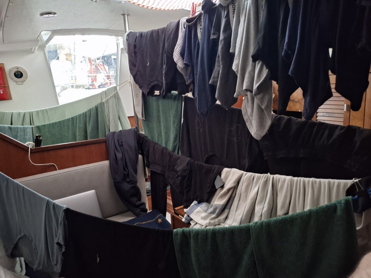 Sie fand einen Waschsalon und fütterte die 18-kg-Maschine. Waschmittel war praktischerweise inklusive. Leider streikte der Trockner – oder sagen wir: er nahm sich sehr viel Zeit. Nach einigen ungeduldigen Blicken auf die Uhr und halbfeuchter Wäsche im Arm ging’s zurück an Bord. „Kein Problem, häng ich eben im Boot auf.“ Tja… das war dann wohl eine Lektion der härteren Sorte.