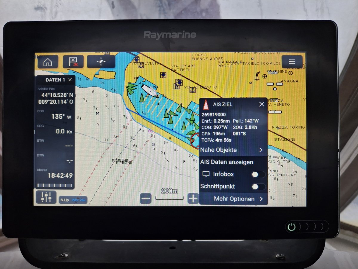 Der Kartenplotter bekam im selben Zug gleich noch ein Software-Update — die IT lässt Jan eben auch auf See nicht los. Frisch aktualisiert und mit dem neuen AIS verbunden, sehen wir nun alle Schiffe, die ihr AIS eingeschaltet haben — und sie wiederum auch uns. Praktischerweise warnt das System bei drohendem Kollisionskurs mit einem Alarm, der allerdings nicht von allein verstummt, sondern erst manuell quittiert werden will.
